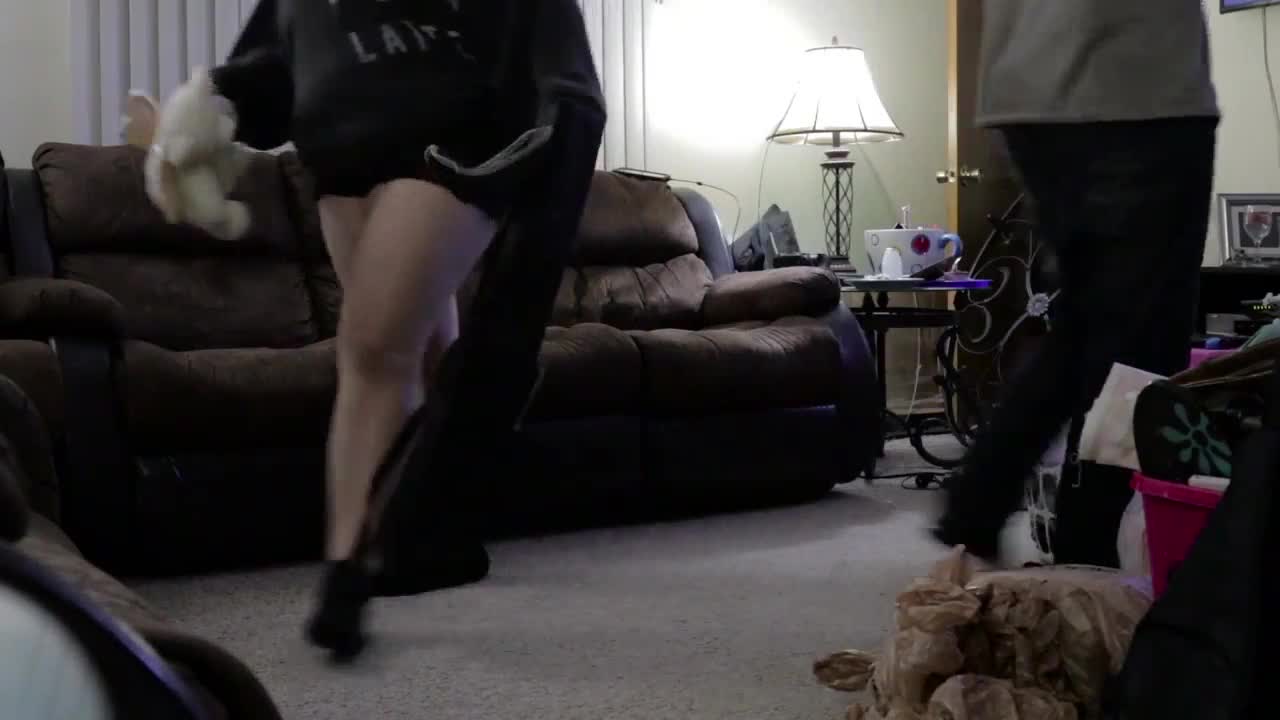 chubby stepmom gets fingered in shorts and lingerie, barefoot on the couch
