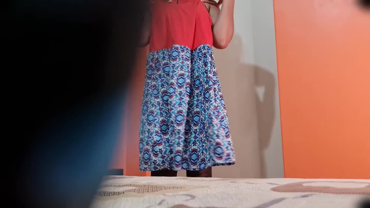 Hey, check out my Colombian stepsister changing her clothes in the room, she's got such a cute style with that miniskirt and all.