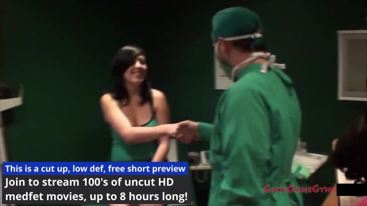 Tanned brunette Jewel with short hair and small tits tries gloves in hospital backstage