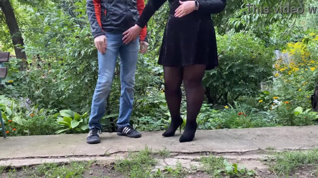 sweet stepmom helps stepson pee standing then flashes hairy wet pussy outdoor