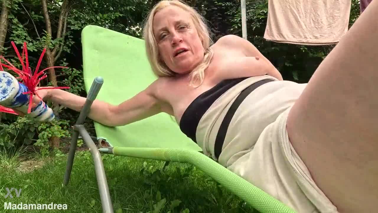 big-titted milf in glasses stretches her pussy with dildo outdoors, craving cock and cumshot.