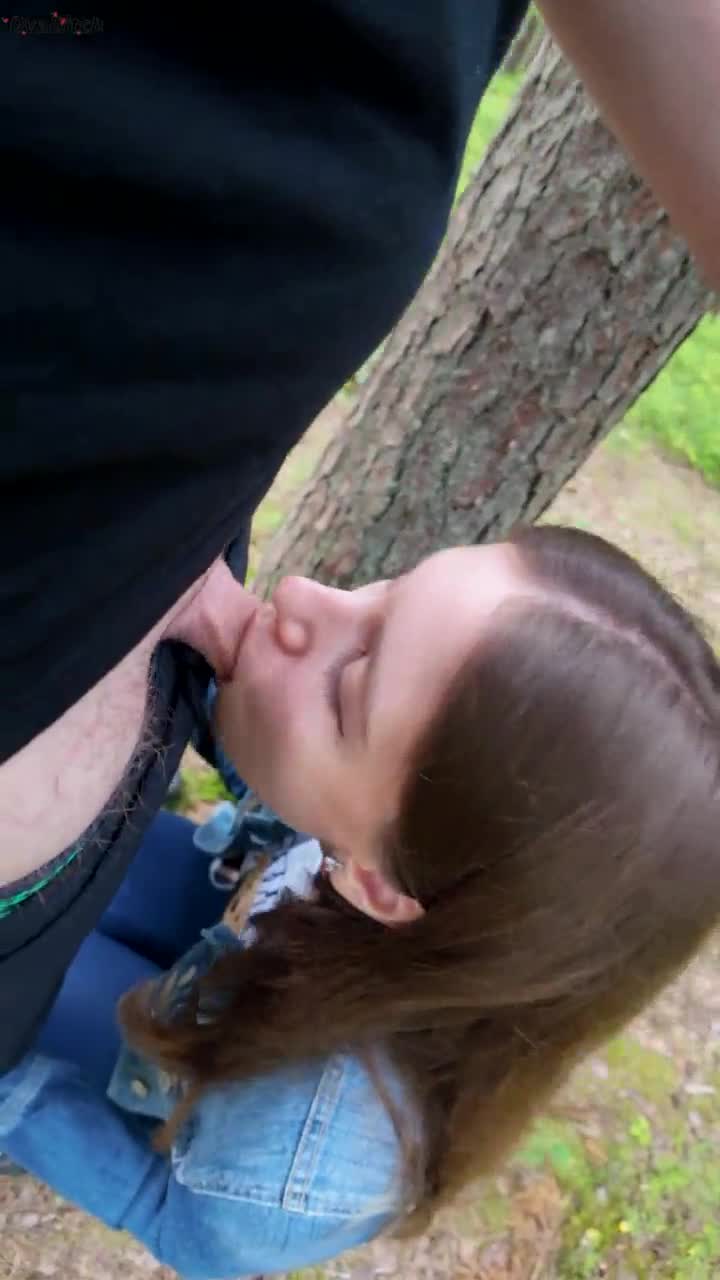 Petite brunette deepthroats and swallows cum outdoors after home fuck