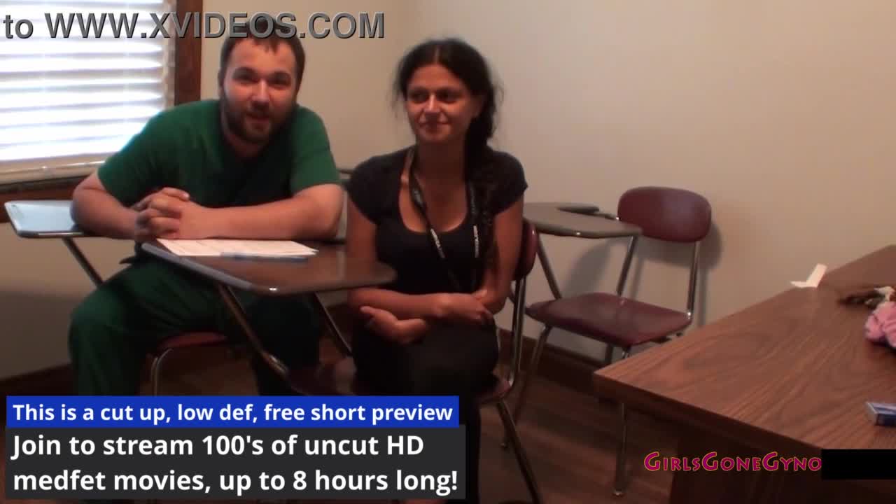 Tanned brunette Jewel with short hair and small tits tries gloves in hospital backstage