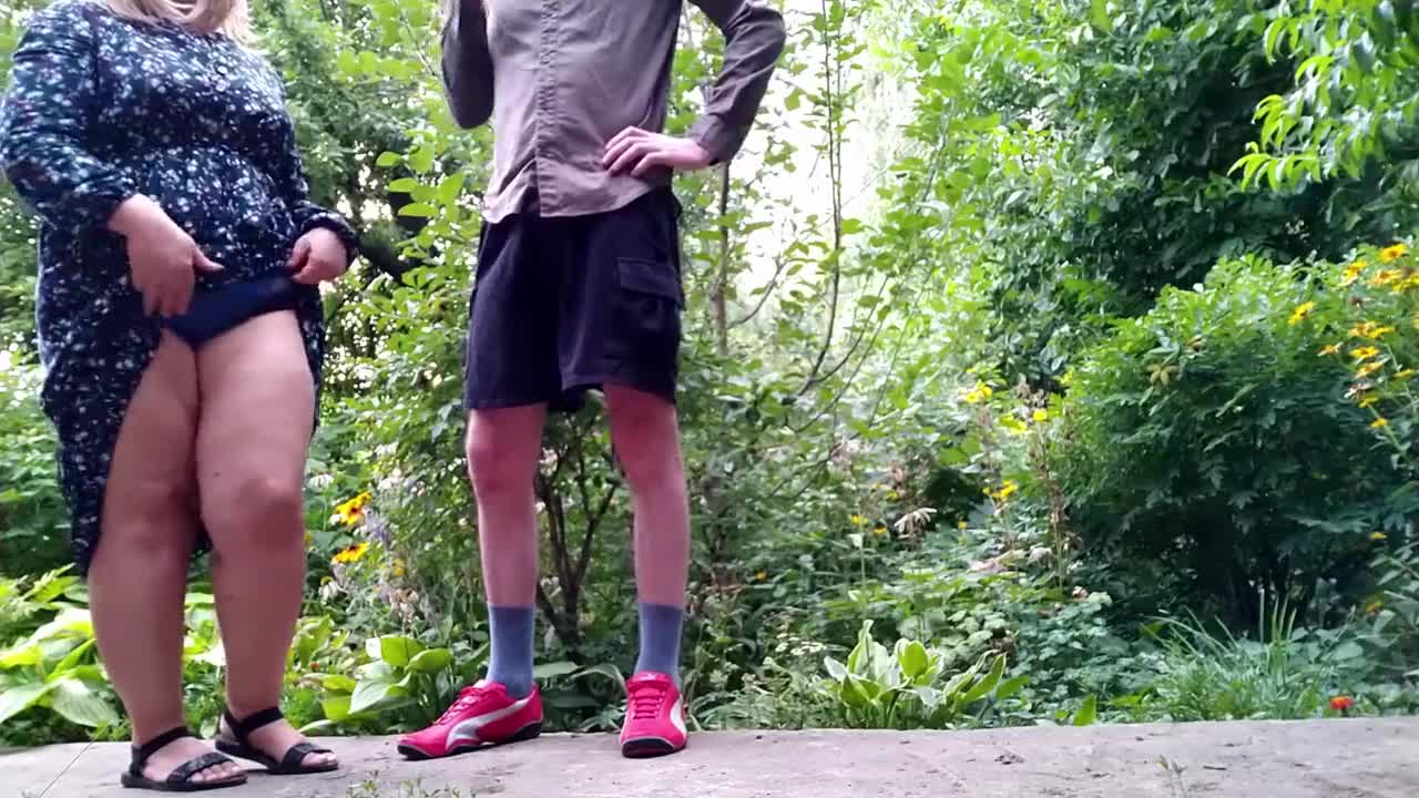 Sweet stepmom helps stepson pee standing then flashes hairy wet pussy outdoor