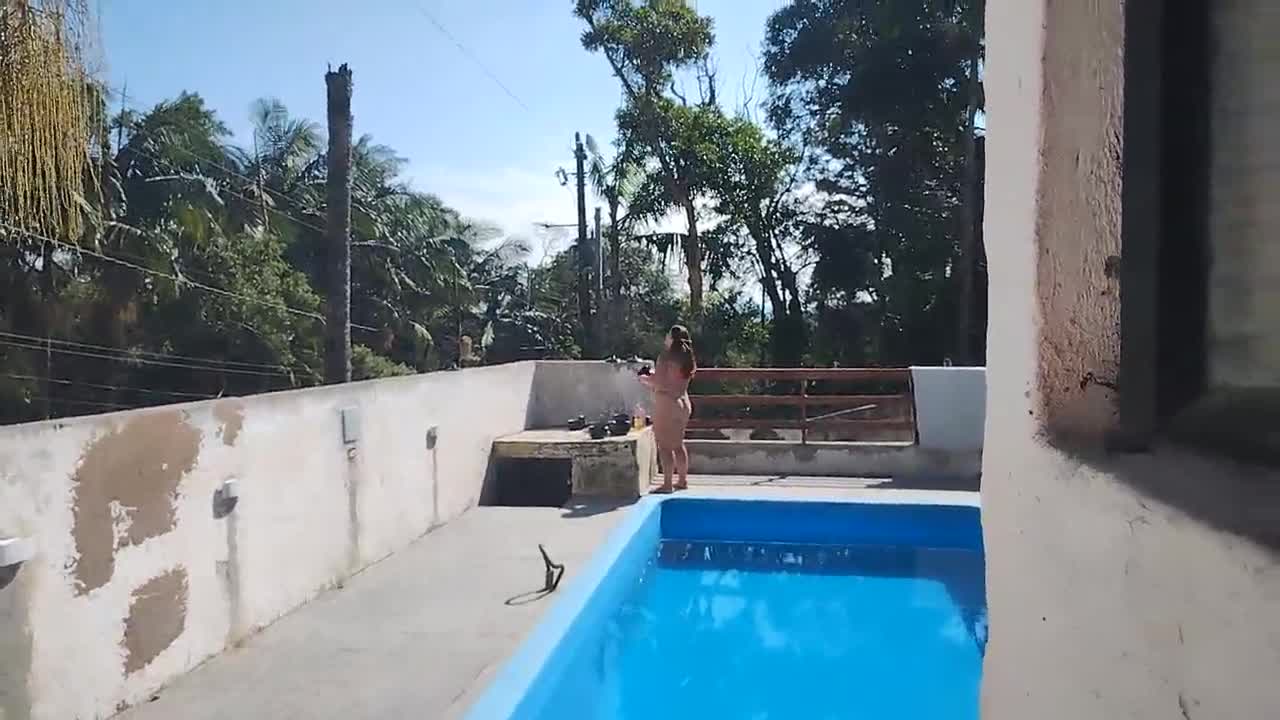 Putinha Flashes Pedreiro by Pool He Jerks Cum All Over Her