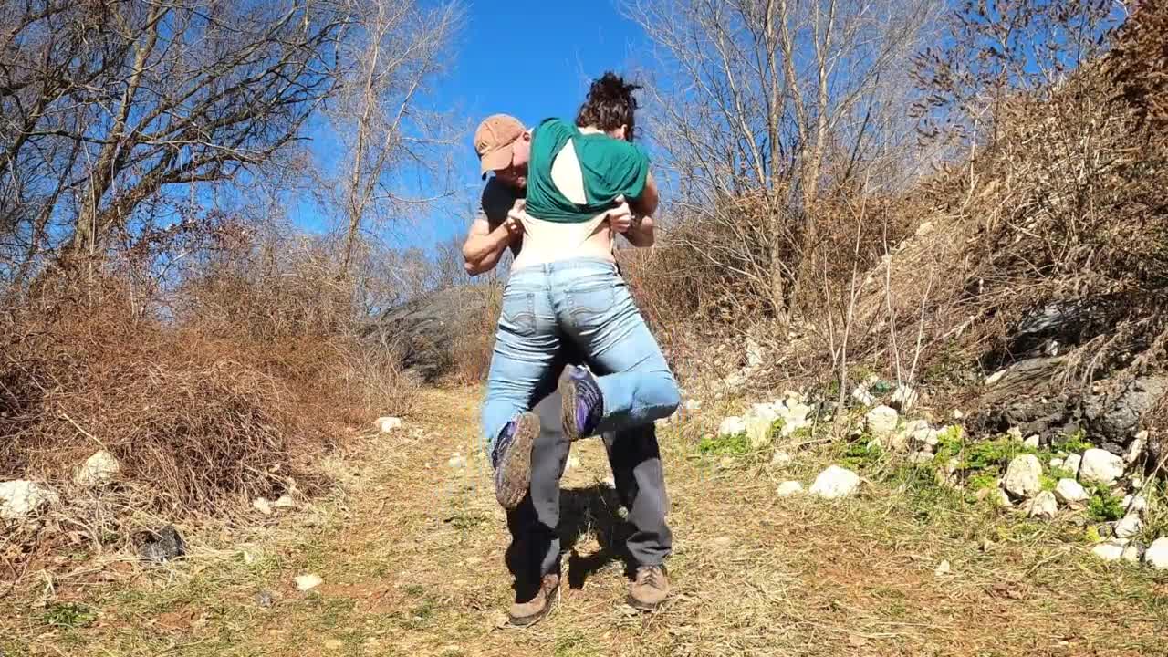 Curvy brunette milf flashes huge ass wedgie in public outdoor humiliation