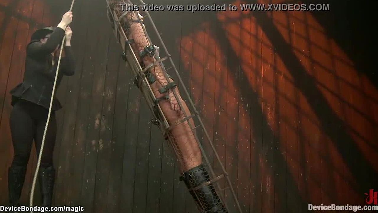 ebony girl bound and hogtied in upside down position, getting toyed with gagging and deepthroat