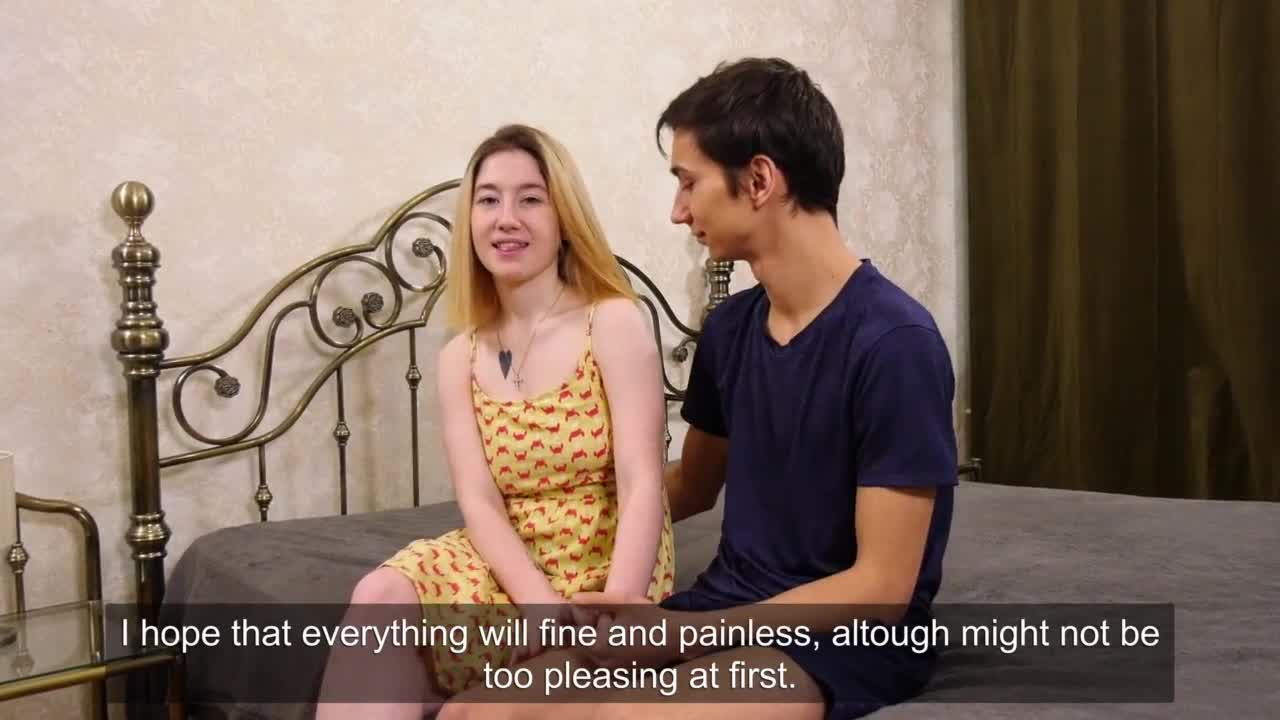 girl overcomes shyness to reveal her virgin pussy for defloration