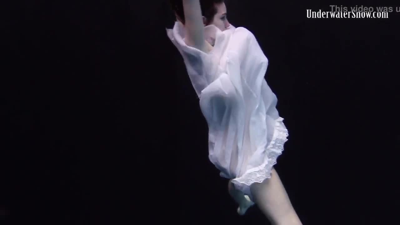White-dressed tight hairy babe Katy Soroka swimming underwater in pool.