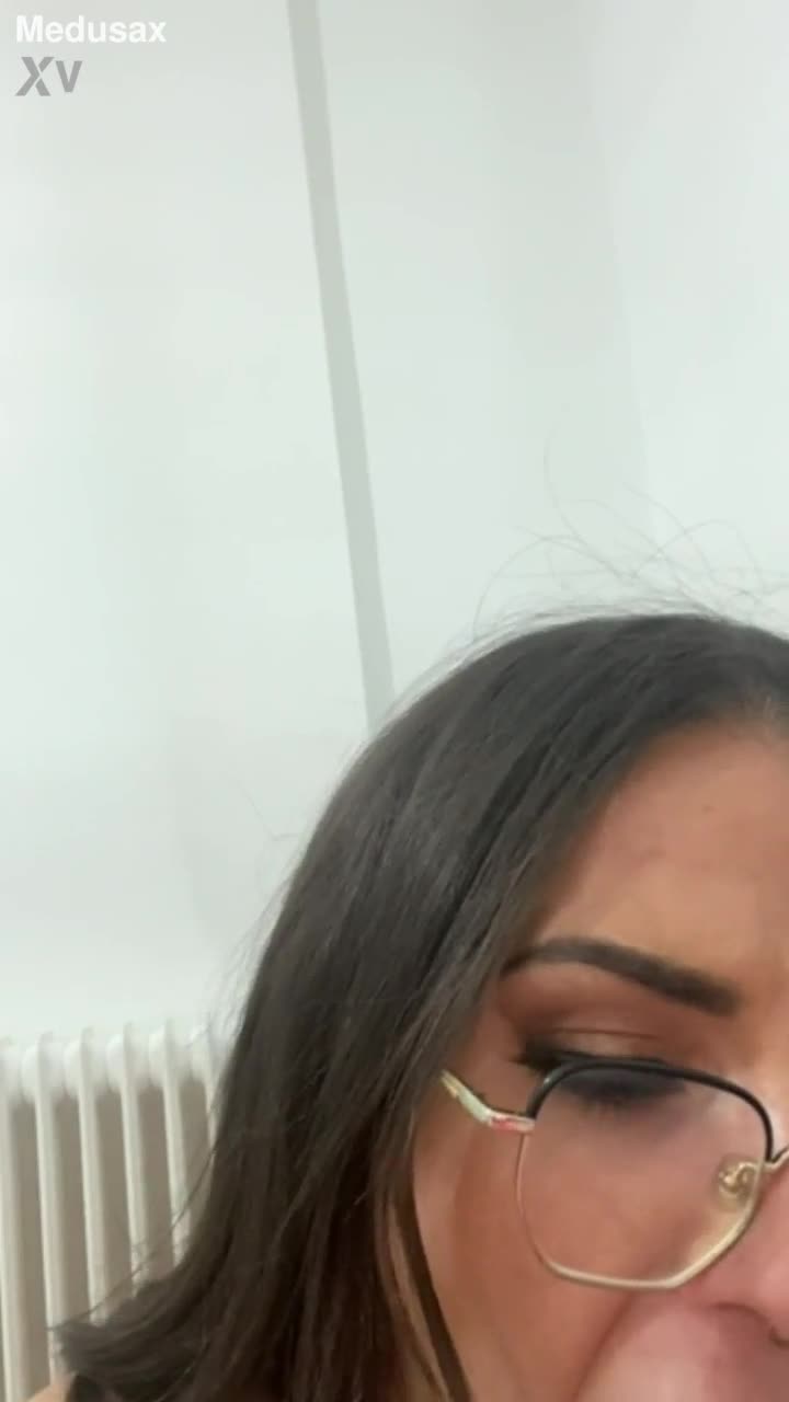 Medusa performs blowjob and titjob on huge dildo while masturbating