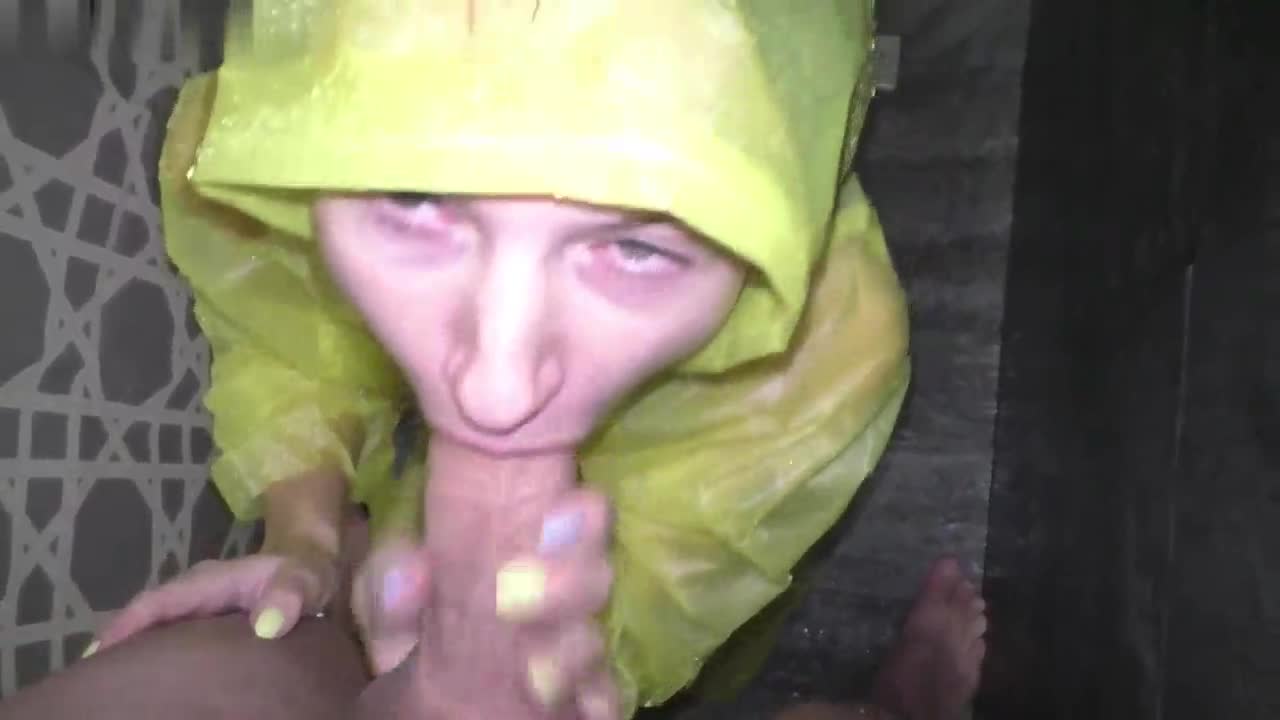 Horny Girlfriend Sucks Cock in Shower with Raincoat On